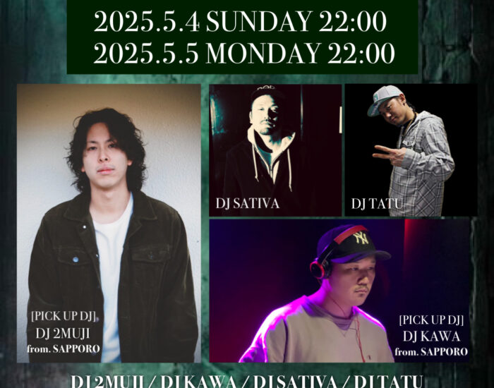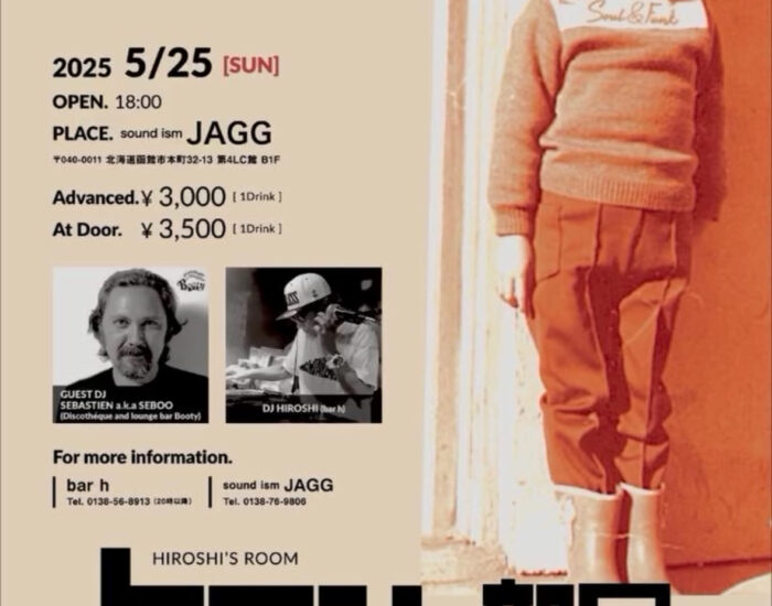 ※コチラはclub COCOAがプロデュースする sound ism JAGG の情報になります。 函館市本町32-13第4LCビルB1 0138-76-9806 sound ism JAGG 2025年5月25日(日) ヒロシの部屋 -HIROSHI’S ROOM- DJ HIROSHI BIRTHDAY COMMEMORATION PROJECT open 18:00 [GUEST DJ] DJ SEBASTIEN a.k.a SEBOO from. SAPPORO (Discothéque and lounge bar Booty) [DJ] DJ HIROSHI (bar h) 前売 ¥3000 当日 ¥3500 (1ドリンク付) 問/ bar h 0138-56-8913 (20時以降) 函館市本町32-13第4LC館B1 0138-76-9806 sound ism JAGG #北海道 #函館 #五稜郭 #dj #dance #livehouse #musicbar #djbar #hiphop #reggae #randb #housemusic #techno #edm #disco #danceclassic #party #event #dancemusic #blackmusic #latin #Reggaeton #ROCK #ロックンロール #citypop #j_pop #k_pop #アニソン #trance #psychedelictrance