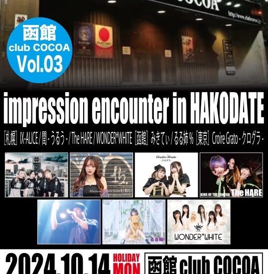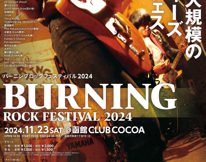 2024年11月23日(土・祝日) BURNING ROCK FESTIVAL 2024 OPEN 14:30 START 15:00 END 24:30 [Act] 五十嵐綾乃 ウクレレナオト THE★EBISTARS カワベシンゴ 木村ケンイチ COUNTDOWN 月光fancy COLD TUBE SHOUT THE⭐︎SHOT SWING DICE Stargazer SWANKY SS(Second shout) 瀬川ヨシヒコ DUST BABY(苫小牧) 田畑裕柾 ツバキ Tetra Notes TOMMY&THE TRYOUT’S みきてぃ 蓑田峻平 The Hakaikosenz (青森) 半夏生(東京) バンバンクラブ(札幌) Fielder’s Choice Pet-Swimmer 堀木光太郎 夢の島の二階 ReeE(札幌) Liva lost nightingale north dove Los Mud’s(苫小牧) [official site] https://burning2024.jimdofree.com/ [協賛] 海老司法書士事務所 焼き鳥BAR 山や PUB Duck PLUS1 A.D. 道南ROCK FES THE BOOSTER LOOSE あうん堂 赤帽子屋 亜細亜的惣菜店ガパオ飯 おれかるかふぇ 市民演劇体験講座 一陣の風 cafe&bar lol カラオケ&ライブバーBrighton 演劇ユニット41 × 46 SAUDADE STUOIO 十割蕎麦 御膳水 BAR木下酒店 Kコバロック 函館BAND WAGON 広島風お好み焼きpick up! フォークソングの店 B♭ MUSIC STORE GDR もちだもちひこ 前売り 一般¥1500 学生¥1000 当日 一般¥2000 学生¥1500 (入場時1ドリンク¥500購入) 函館市美原1-19-12 0138-45-2002 club […]