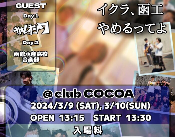 2024年3月10日(日) 函工軽音部主催 卒業ライブ 2023 open 13:15 start 13:30 [Guest] 函館水産高校音楽部 入場料 一般 ¥3000 学生 ¥1500 卒業生 ¥500 小学生以下無料 問/ 0138-51-2271 函館工業高等学校 (軽音部顧問) 函工軽音部 X(旧Twitter) @KANKO_KON 函館市美原1-19-12 0138-45-2002 club COCOA #北海道 #函館 #cocoa #dj #dance #livehouse #hiphop #reggae #randb #housemusic #techno #edm #disco #danceclassic #party #event #dancemusic #blackmusic #latin #Reggaeton #ROCK #ロックンロール #citypop #j_pop #k_pop #アニソン #trance #psychedelictrance