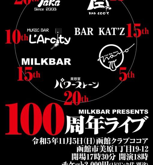2023年11月5日(日) MILKBAR PRESENTS 100周年 ライブ (Band Live) open 17:30 start 18:00 [出演] Bar TAKA / BAR COO’S MUSIC BAR L’Arcity / BAR KAT’Z MILKBAR / Live Bar Nano 美容室 パワーストーン 前売 ¥2000 (1ドリンク購入制) 問/函館市美原1-19-12 0138-45-2002 club COCOA #北海道 #函館 #cocoa #dj #dance #livehouse #hiphop #reggae #randb #housemusic #techno #edm #disco #danceclassic #party #event #dancemusic #blackmusic #latin #Reggaeton #ROCK #ロックンロール #citypop #j_pop #k_pop #アニソン #trance #psychedelictrance