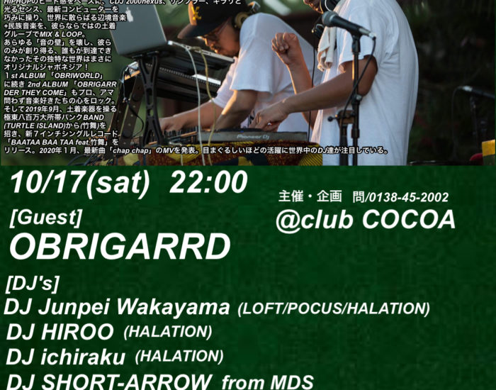 10月17日(土) open/start 22:00 [Guest] OBRIGARRD [Dj’s] DJ Junpei Wakayama (LOFT/POCUS/HALATION) DJ HIROO (HALATION) DJ ichiraku (HALATION) DJ SHORT-ARROW from MDS (MUSICALITY DEMANTIA/STORY TELLER) DJ MAKOTO from MDS (MUSICALITY DEMANTIA/STORY TELLER) DJ RYOHEY from MDS (MUSICALITY DEMANTIA/STORY TELLER) 前売 \2000 当日 \2500 (1ドリンク購入制\500) 主催・企画 / 問 0138-45-2002 club COCOA ※新型コロナウイルス対策 マスク着用 換気対策 アルコール用意 通知システム登録