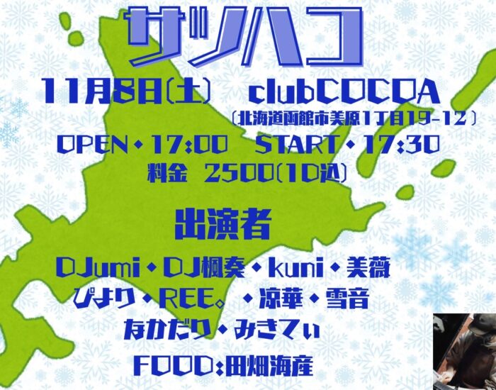 ※コチラはclub COCOAがプロデュースする sound ism JAGG の情報になります。 函館市本町32-13第4LCビルB1 0138-76-9806 sound ism JAGG 2025年11月25日(土) FLIP SIDE (HipHop) open 22:00 [RELEASE LIVE] G-MA & 呼煙魔 [Live] J.E.R.O KOLD fr. SAPPORO hnt. fr. SAPPORO YU-$HI öwson [DJ] RYOKKE NAKKUN MAKKO EIJI [Dance] Toshi ENTRANCE ¥2000 (1ドリンク購入制) 函館市本町32-13第4LC館B1 0138-76-9806 sound ism JAGG #北海道 #函館 #五稜郭 #dj #dance #livehouse #musicbar #djbar #hiphop #reggae #randb #housemusic #techno #edm #disco #danceclassic #party #event #dancemusic #blackmusic #latin #Reggaeton #ROCK #ロックンロール #citypop #j_pop #k_pop #アニソン #trance #psychedelictrance